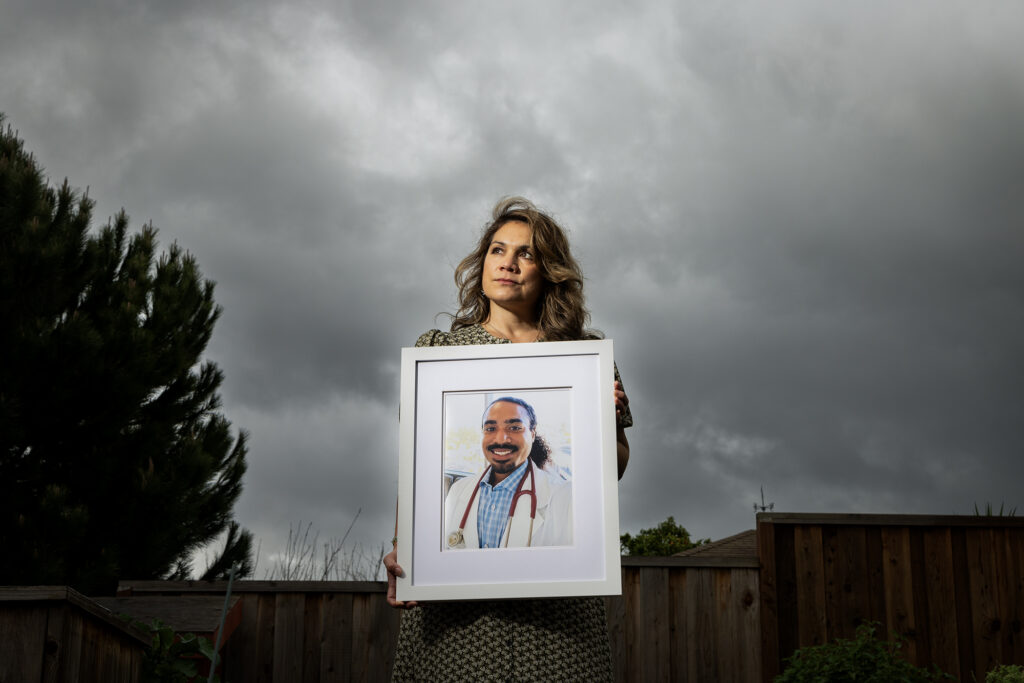 Nora Lopez holds a framed photo of her son at her home in Castro Valley on March 12, 2025. Her 29-year-old son, Dominic Lopez-Toney, was struck and killed by a semi-truck days before starting his surgical rotation at a San Joaquin hospital.