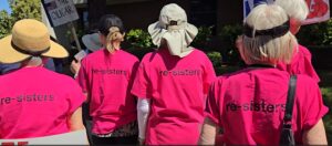 A group of women of different ages, wearing bright pink t-shirts that state “re-sisters,” were part of the Chico protest. LeAnn Jenswold, the organizer, said there are about 16 women who belong to the “re-sisters.”