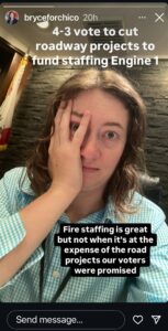 O’Brien, a former Chico police chief, made the passing motion, which defers road improvement projects to fund the engine staffing. His motion was supported by Mayor Kasey Reynolds, Vice Mayor Dale Bennett and Councilmember Tom van Overbeek after an alternative motion from other councilmembers failed.