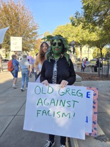 “I was really inspired by the way people are protesting in Portland,” said Morgan Szymczak, a local therapist who participated in the march dressed as the comedy character Old Gregg. “Part of what we are missing is humor and levity, the ability to put our own influence into the narrative that is being spun by the media. Then we can have conversations with people that aren’t just about hatred and fear, but the things we want to see as a country.”