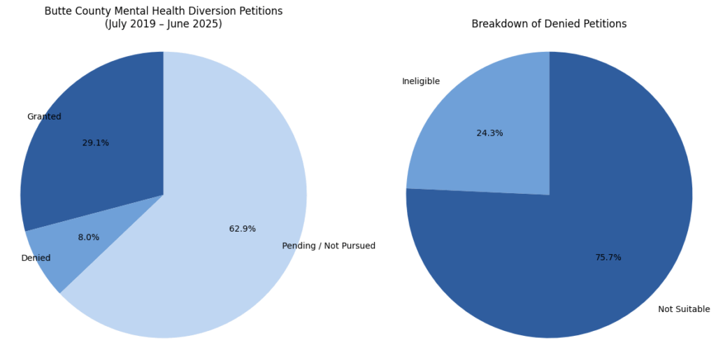 From July 2019 through June 2025, only about 29% of petitions filed by defendants seeking MHD were granted in Butte County, according to data from the California Judicial Council.