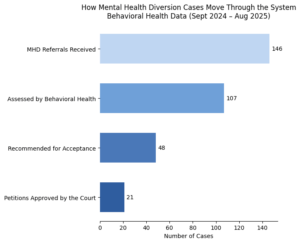 Between September 2024 and August 2025, Behavioral Health received 146 MHD referrals and assessed 107 of them. Of those 107, the department recommended 48 for acceptance into the program. However, ultimately, only 21 petitions were approved.