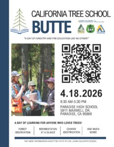 Una jornada de educación llamada California Tree School (Escuela del Árbol de California) el 18 de abril estará abierta a todos, según los organizadores en el Butte Fire Safe Council. El evento en Paradise High School dirigido por el departamento de Agricultura y Recursos Naturales de la Universidad de California y patrocinado por la Sociedad de Silvicultores Americanos, no es una feria de empleo, según Kiara Heacock del Butte Fire Safe Council, sin embargo es una buena oportunidad para hacer conexiones.