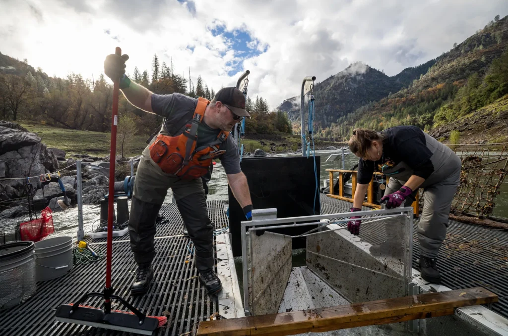 Cassandra Curl, with the Winnemem Wintu Tribe, and Justin Call, environmental scientist, work on the California Department of Water Resources’ Juvenile Salmonid Collection System Pilot Project in the upper McCloud Arm of Lake Shasta in Shasta County on Nov. 20, 2025. Photo by Xavier Mascareñas, California Department of Water Resources and courtesy of Cal Matters.