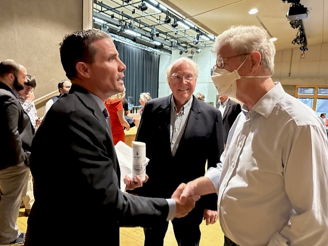 Sen. Mike McGuire speaks with a moderator at the Santa Rosa candidates forum. Photo by Lindajoy Fenley